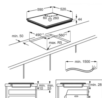 Διαστάσεις εντοιχισμού (cut‑out): 44 × 560 × 490 mm.